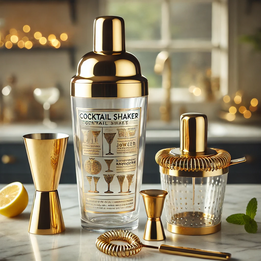 • Recipe-Printed Glass Cocktail Shaker (with gold lid) – 18oz capacity